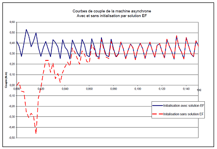 The curve of the time variation of the electromagnetic torque of the asynchronous machine is represented in the figure below in the two following conditions: with or without initialization by a FE solution.