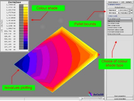 - the color shade which specifies the correspondence between the color shade and the spatial values displayed on the supports; this pallet can be resized and/or moved on the isovalues plotting by means of the mouse in order to distinguish more easily the value of the spatial quantity at each point of the support