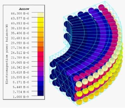 Picture below shows how the error is displayed for 3D applications. Contrary to 2D application where a colour shade constant by element is display, a coloured ball by element is displayed. In order to better visualise where the error stand, you may have to modify the ball density and the scale.