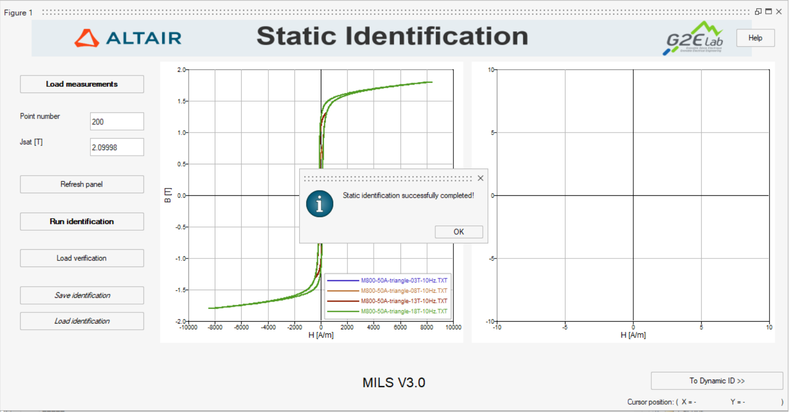 will open a dialog box asking for an additional set of measurement files. Note: In this verification step, the user may choose between loading the same measurement set used in step 1.1 or a different one. In any case, MILS uses the identified static model to reconstruct a hysteresis loop for each file, by admitting a B(t) input issued from the loaded file.Note: MILS plots the reconstructed hysteresis loops yielded by the static LS identification in red in the Verification window of the static identification panel. The measurements loaded for verification are also plotted for comparison.Note: MILS estimates the error in the evaluation of the static component of the iron losses by comparing areas of the hysteresis loops. The percent error between the identified model and a measurement file is displayed in the legend of the Verification window, as shown in Figure 5.
