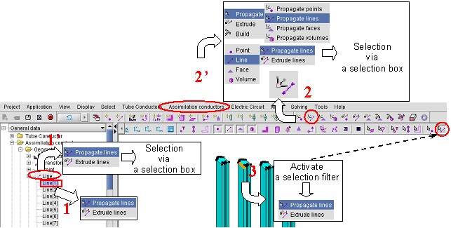 To activate the Propagate lines command, which requires data selection, choose one of the methods presented in the figure below: