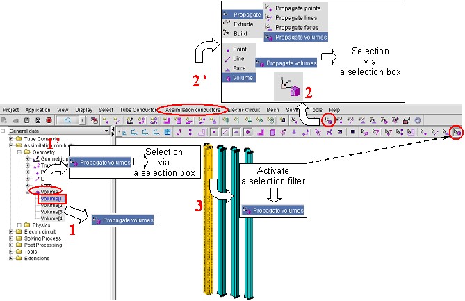 To activate the Propagate volumes command, which requires data selection, choose one of the methods presented in the figure below: