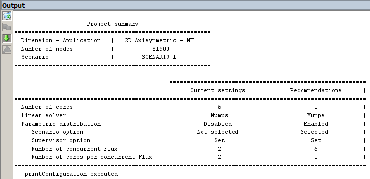 Selecting the command Show recommended configuration for a given scenario will display two tables with information in the Output console.