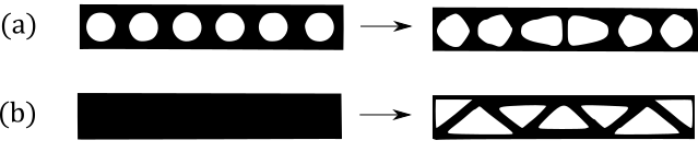 In Free-shape optimization, the boundaries of selected parts of an initial design are iteratively displaced and modified by the procedure. The result is an improved shape that satisfies the optimization criteria and that usually resembles the original design. Topological optimization methods, on the other hand, are based upon the addition or removal of the matter composing the parts being optimized. This process is governed by the evolution of the values of a material density function throughout the optimization procedure, and frequently leads to quite innovative shapes that may not have been previously considered. Figure 1 illustrates both approaches in the simple case of the optimization of a beam.