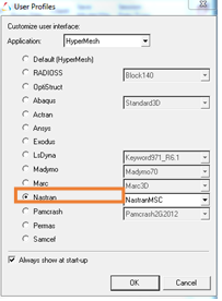 2 In the « user Profiles » window choose the «Nastran» or «OptiStruct» format and validate the box