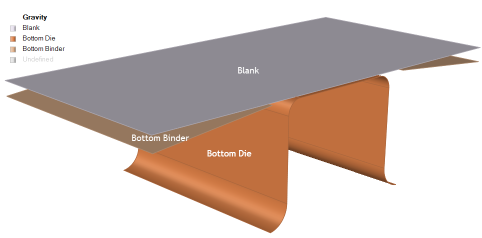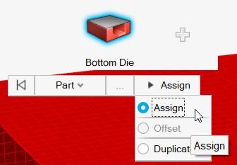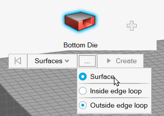 Tip: When working with surfaces, you can quickly select surfaces inside or outside an edge loop. When Inside edge loop or Outside edge loop is selected, clicking Create automatically selects the surface inside or outside the red loop indicator, significantly reducing model setup time.Note: The example model includes a bottom binder in addition to the default bottom die.