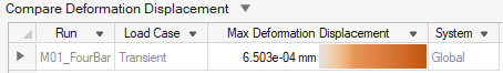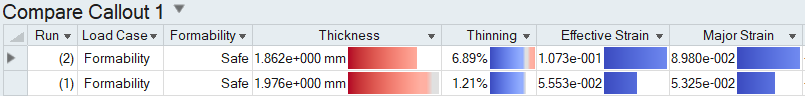 Additional columns can be added to show additional result types and parameters from the Run Analysis window. The red-blue color bands correspond to the legend in the Analysis Explorer; the width of the band indicates the magnitude of the result. Changes to the upper and lower bound in the Analysis Explorer are automatically reflected in the Compare Analysis Results table.
