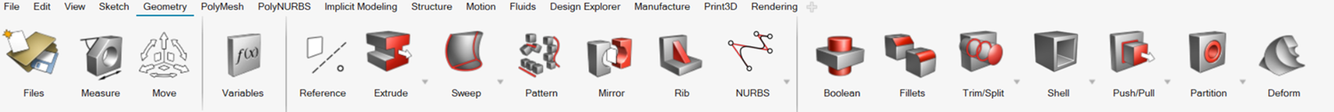 - Use the Geometry, Structure, and remaining tabs to access tools organized in icon groups. Icons may provide access to several different tools, and hovering over an icon may reveal additional satellite icons.