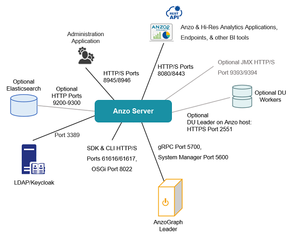 | 61616 | HTTP port used by the software development kit (SDK) and command line interface (CLI) | Available on the Anzo server and between Graph Studio and client workstations if installing the CLI or SDK remotely |