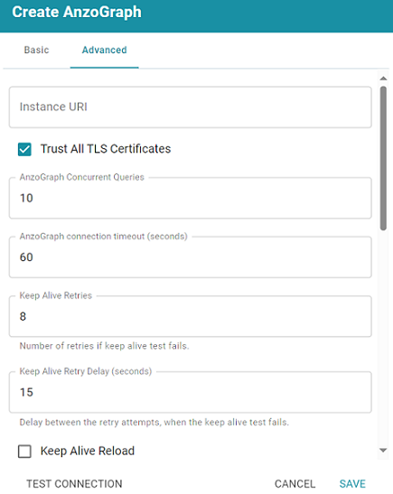 | AnzoGraph Connection Timeout | Controls how often (in seconds) Graph Studio checks the status of the connection to this Graph Lakehouse instance. The connection is tested every N seconds, where N is the value of this setting. The default value is 60. If the test fails, Graph Studio re-tests the connection every 15 seconds for 2 minutes to rule out a brief network glitch. If the connection continues to fail after 2 minutes, the status is changed to "Offline." If the connection is re-established within the 2-minute window, Graph Studio determines whether the connection came back automatically or whether Graph Lakehouse was restarted. |