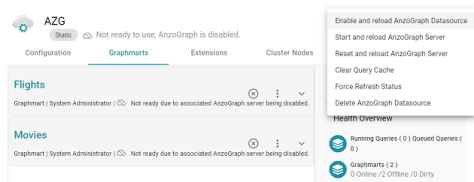 | Keep AnzoGraph Datasource Enabled on Anzo Startup | This option is enabled by default and means that Graph Studio leaves the Graph Lakehouse data source online in a "Ready to use" state if Graph Studio is restarted (if this data source is online at the time Graph Studio is restarted). When this option is disabled, Graph Studio disables this data source when Graph Studio is restarted. When Graph Studio comes online, this source must be manually enabled by selecting Enable and reload AnzoGraph Datasource from the menu on the Graph Lakehouse administration screen. For example: