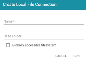 - Click the Add File Connection button and select the type of file connection that you want to create. For the local disk or mounted NFS, choose Local File Connection. Graph Studio displays the create connection screen for the type of connection you chose.