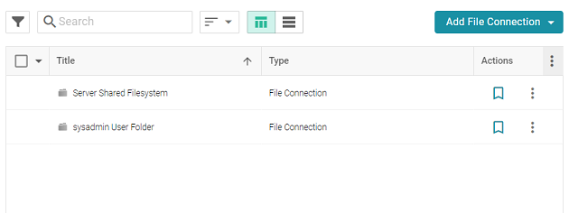 - In the Administration application, expand the Connections menu and click File Store. Graph Studio displays the File Store screen, which lists existing file store connections. For example: