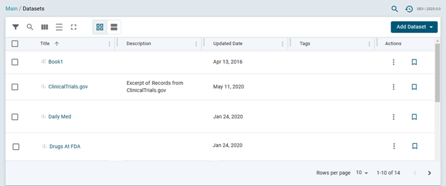 - The Datasets screen lists the catalog of datasets. For example: