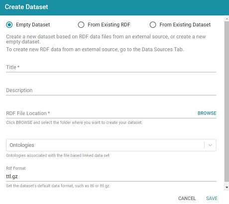 - Lastly, the RDF Format setting defaults to ttl.gz, meaning files that are output to this dataset will be in compressed Turtle format. This is the ideal format for preserving space on the file store. If you do not want the files to be compressed, you can change the value to ttl.