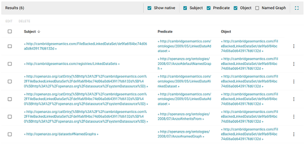 4. Paste in the Object field the LDS URI that you copied in the first step. Then click Find. Graph Studio returns the set of quads for which the LDS URI is the object. For example: