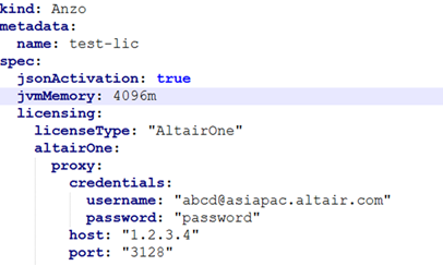 spec.licensing.altairone.proxy- HTTPS proxy details for Managed Altair Units Licensing. If an HTTPS proxy is used, specify the proxy host and port, proxy username and password (if applicable). -