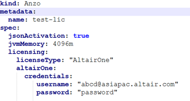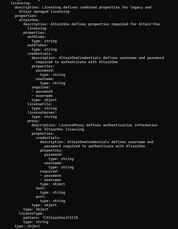 spec.licensing.altairone.credentials- For Managed Altair Units Licensing, you can specify Altair One account credentials here (basic authentication using username and password). -