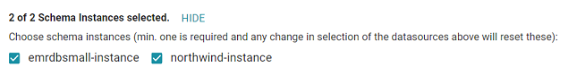 - Select the checkbox next to the data source that you want to add to the graphmart. (Users with the Batch Direct Data Loading permission can select multiple sources.) The selected schema or schemas are shown at the bottom of the screen. For example, in the image a below, a source with two schema instances is selected.