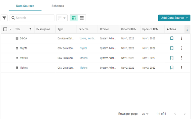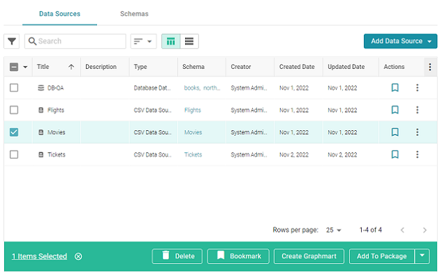 - In the Graph Studio application, expand the Onboard menu and click Structured Data. Graph Studio displays the Data Sources screen, which lists any existing sources. For example: