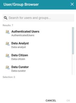 - Add a user or group: Click Add a user or group. On the User/Group Browser dialog box, select the users or groups that you want to add. Then click OK.