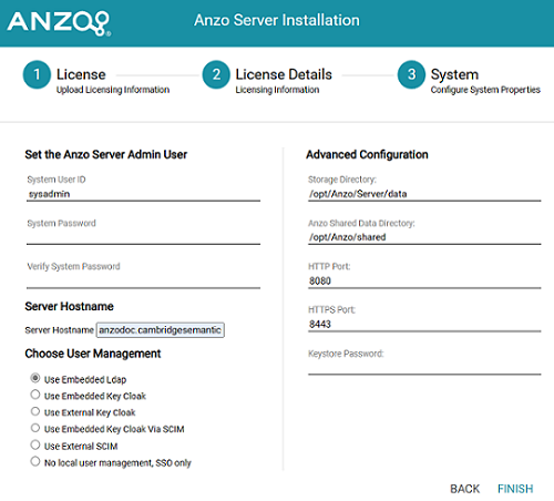 16. The wizard displays your license details. Review the details and then click Next. The wizard displays the System Configuration screen. Note that the user management options that appear on this screen differ depending on the options that were chosen during the installation: