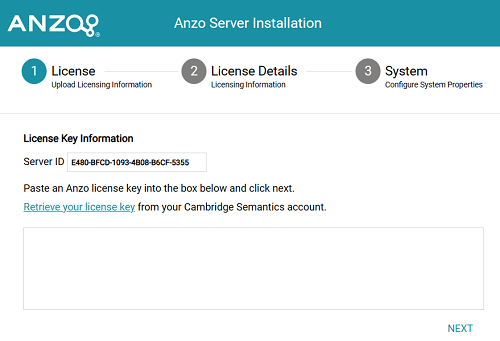 15. Paste your license key into the box and then click Next. If necessary, you can obtain the license key by clicking Retrieve your license key and logging in to your Cambridge Semantics account.