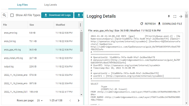 2. Select the anzo_gqe_info.log file. The contents of the file are displayed in the Logging Details section of the screen. For example: