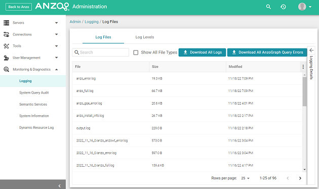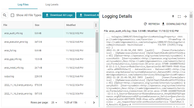 The Audit Log Packages are now enabled and will start to log the events described above. The log messages are captured in anzo_full.log as well as a new file called anzo_audit_info.log. All Graph Studio log files are generated in the <install_path>/Server/logs directory on the server. Files in that directory can be viewed and downloaded from the Administration application.