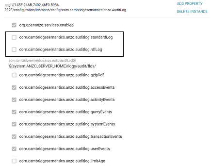 - Find the com.cambridgesemantics.anzo.auditlog.standardLog and com.cambridgesemantics.anzo.auditlog.rdfLog properties (shown below).