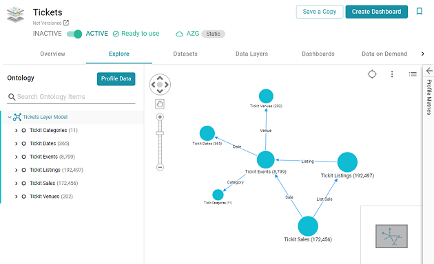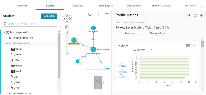 7. Once the profiling is complete, the Profile Metrics panel is expanded on the Explore tab. To populate the panel, click a class or property in the Ontology or a class in the graph view in the middle of the screen. For example: