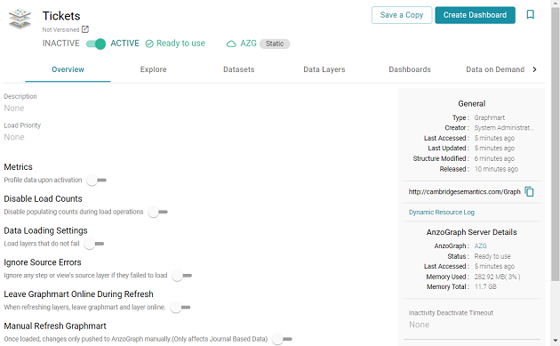 2. On the Graphmarts screen, click the name of the graphmart for which you want to generate metrics. Graph Studio displays the Overview for that graphmart. For example: