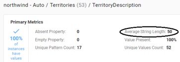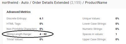 For each string property, this metric reports the range of string value lengths.