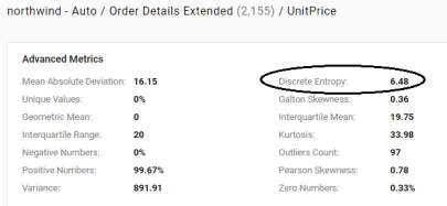 For each numeric property, this metric computes the Pearson coefficient of skewness to show the distribution of values. A value of 0 indicates no skew, a positive number indicates positive skew, and a negative number indicates negative skew.