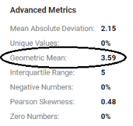 For each numeric property, this metric computes the geometric mean of all of the values.