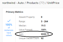 For each numeric property, this metric computes the sum of all values.