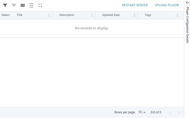 - In the Administration application, expand the Servers menu and click Plugin Configuration. The Plugin Configuration screen is displayed. For example: