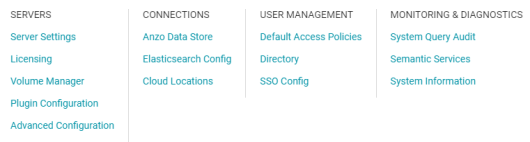 Some menu items in the above image, such as Semantic Services, AnzoGraph, and Anzo Data Store, are also controlled by more granular permissions: Manage Semantic Services, Manage AnzoGraph, and Create Anzo Data Stores. To give an administrator full create, modify, and delete access to those functions, the granular permissions need to be enabled in addition to Administer System Setup. |