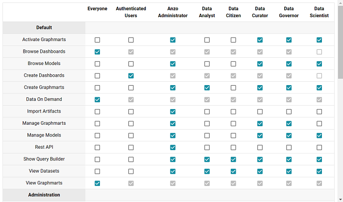 | Manage AnzoGraph | Gives permission to view and create Graph Lakehouse connections. Does not give permission to delete connections or change the configuration of an existing connection. Administer System Setup is required to grant permission to delete and change existing Graph Lakehouse connections. |