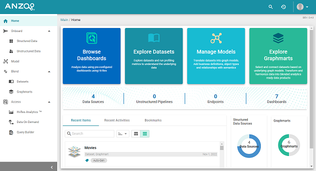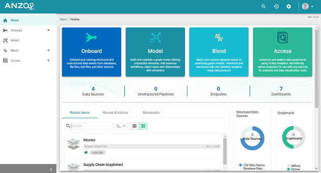 By default the Data Governor role has access to the Onboard menu, Model manager, Blend menu, Access menu, and Activity Log in the Anzo application. The image below shows an example of the view a user with the Data Governor role has in the Anzo application.