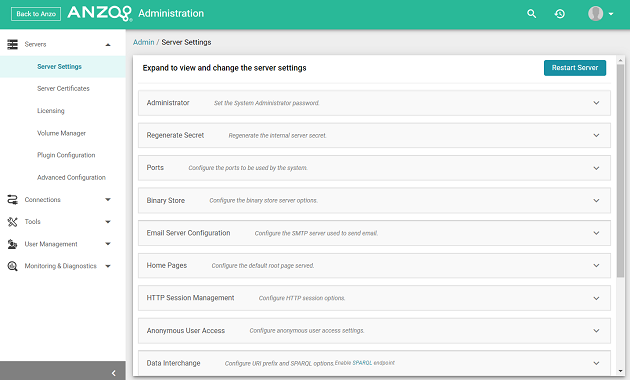The following image shows an example of the Anzo Administrator view of the Administration application.