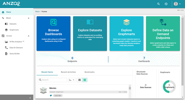 By default the Data Citizen role has access to the Blend menu, Access menu, and Activity Log in the Anzo application. The image below shows an example of the view a user with the Data Citizen role has in the Anzo application.