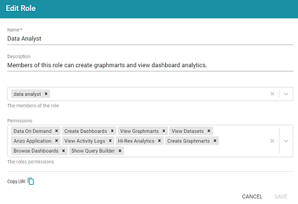 - Click the name of the role for which you want to configure permissions. Anzo opens the Edit Role dialog box. For example: