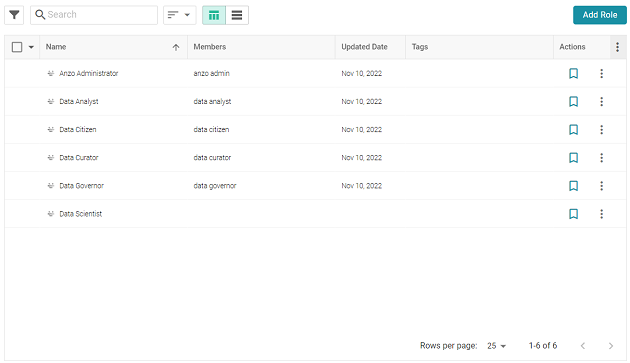 - In the Administration application, expand the User Management menu and click Roles. Anzo displays the Roles screen, which lists the existing roles. For example: