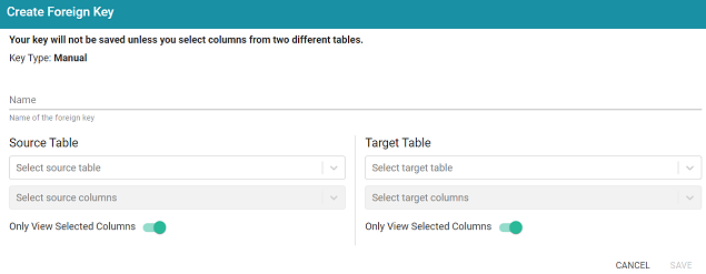 - Source Columns: The source column is the column that becomes the foreign key to the target table's primary key. Click the Select Source Columns drop-down list and select the source column. To create a composite key by selecting an additional column, click the Select Source Columns drop-down list again and select a column.