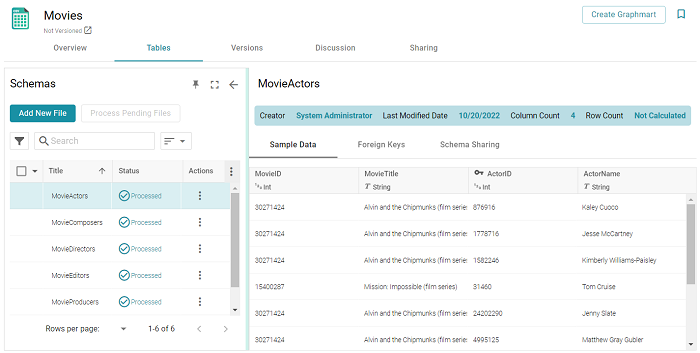 - Click the schema for which you want to assign foreign keys. Graph Studio displays the Tables tab for the data source that contains the schema. For example: