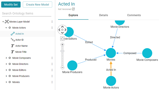 When you onboard the data using this schema, the foreign keys become RDF OWL object properties in the data model. For example, the image below shows a portion of the model that was generated after ingesting the schema that has the foreign key in the example above. In the model, Acted In is an object property in the Movie Actors class:
