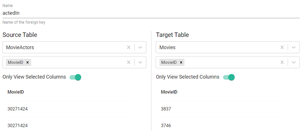 For example, the image below creates a relationship called actedIn where the MovieID column in the MovieActors table becomes the foreign key and references the values from the primary key column, MovieID, in the Movies table.