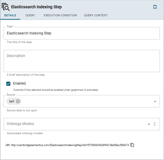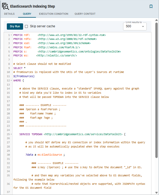 - When you have finished configuring the Details tab, click the Query tab. This tab contains the Elasticsearch indexing query to run. The template includes the syntax for writing a SPARQL SELECT query that uses the Graph Data Interface (GDI) to generate the index on the Elasticsearch server. Unlike queries for other steps, this step does not run an INSERT query because the data is not being inserted into Graph Lakehouse. For general information about writing GDI queries against Elasticsearch sources, see Querying an Elasticsearch Source.