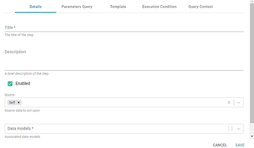 - To create a new Query-Driven Templated step, select Query Driven Templated Step and then click OK. If you want to clone an existing step, click the Existing Steps tab, select the step that you want to clone, and then click OK. Graph Studio creates or clones the step and displays the Details tab: